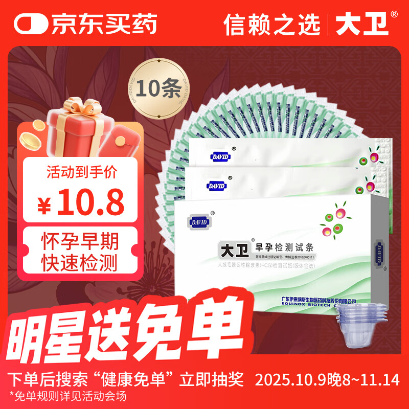 大卫验孕棒早早孕试纸10条 快速验孕测孕高精准测怀孕高灵敏 含尿杯