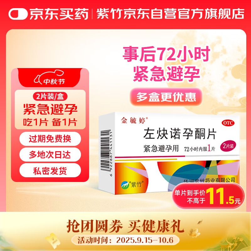 金毓婷2片装 72小时紧急避孕 女性事后短效口服避孕药 左炔诺孕酮片1.5mg*2片